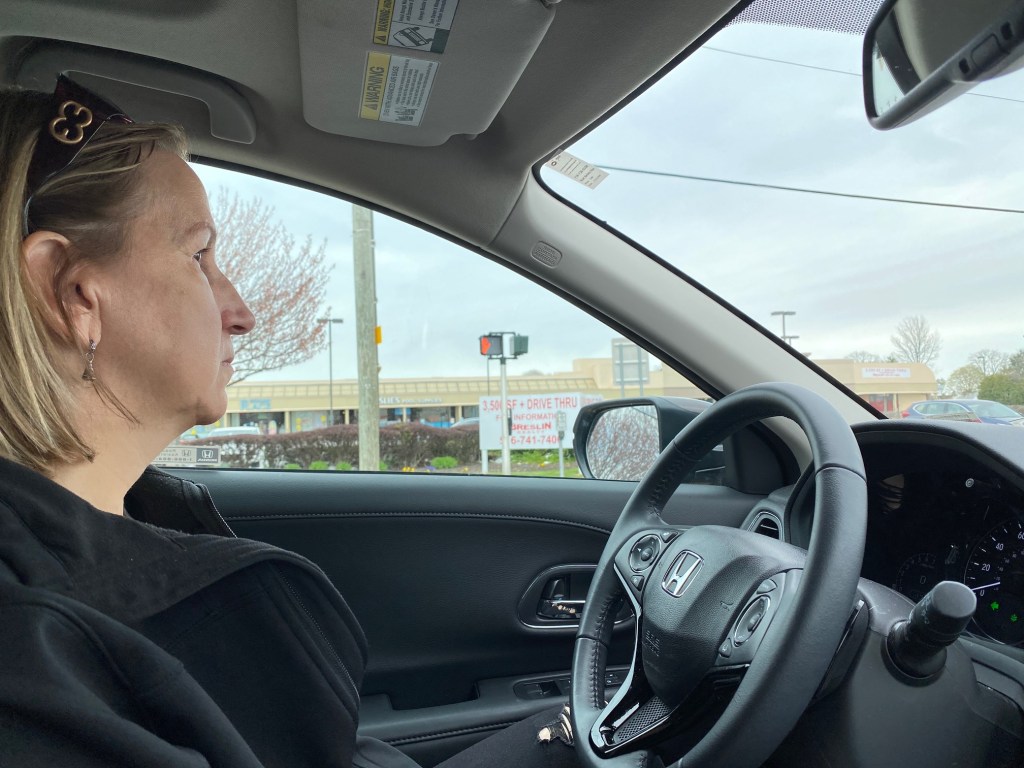 My mom at a red light as we arrive at Walmart.