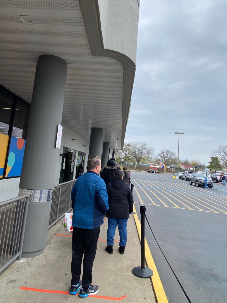 Customers distance themselves while waiting outside of Walmart.