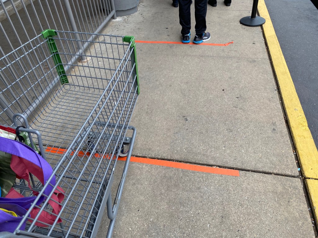 My mom makes sure to keep the wagon inside of the orange markings to maintain proper social distancing