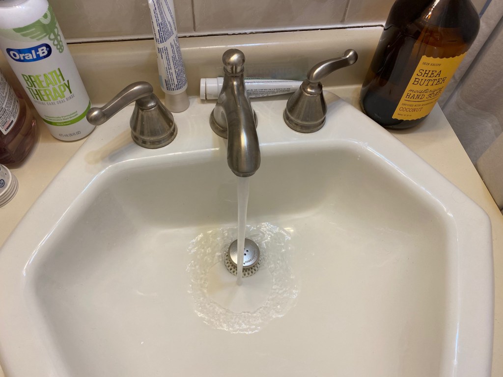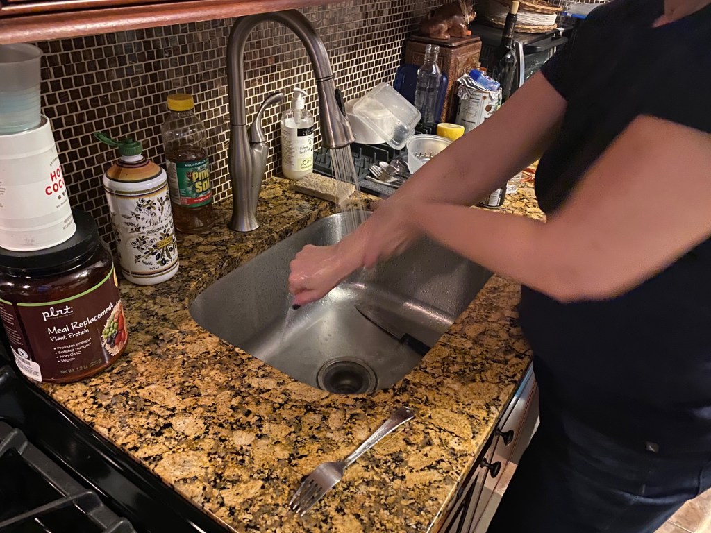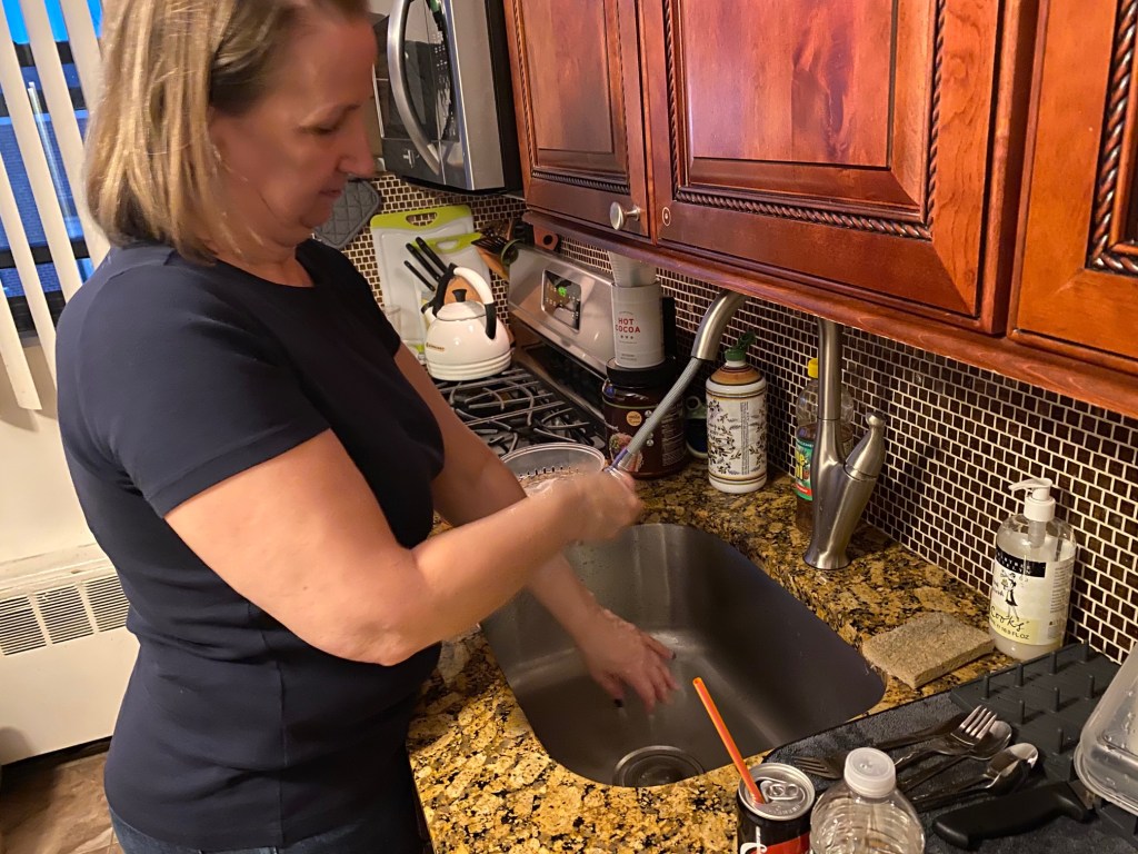 While telling me to wash my hands, my mom does the same in the kitchen.